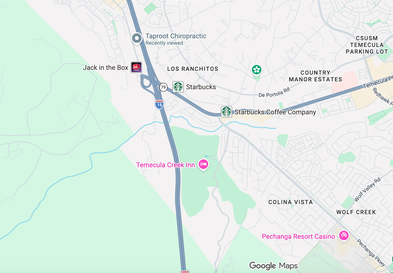 From Central Fallbrook / Main Avenue area: Head east on Mission Rd to I-15 South. Exit at CA-79/Temecula Parkway and continue toward Old Town Temecula. Approximately 22 minutes.