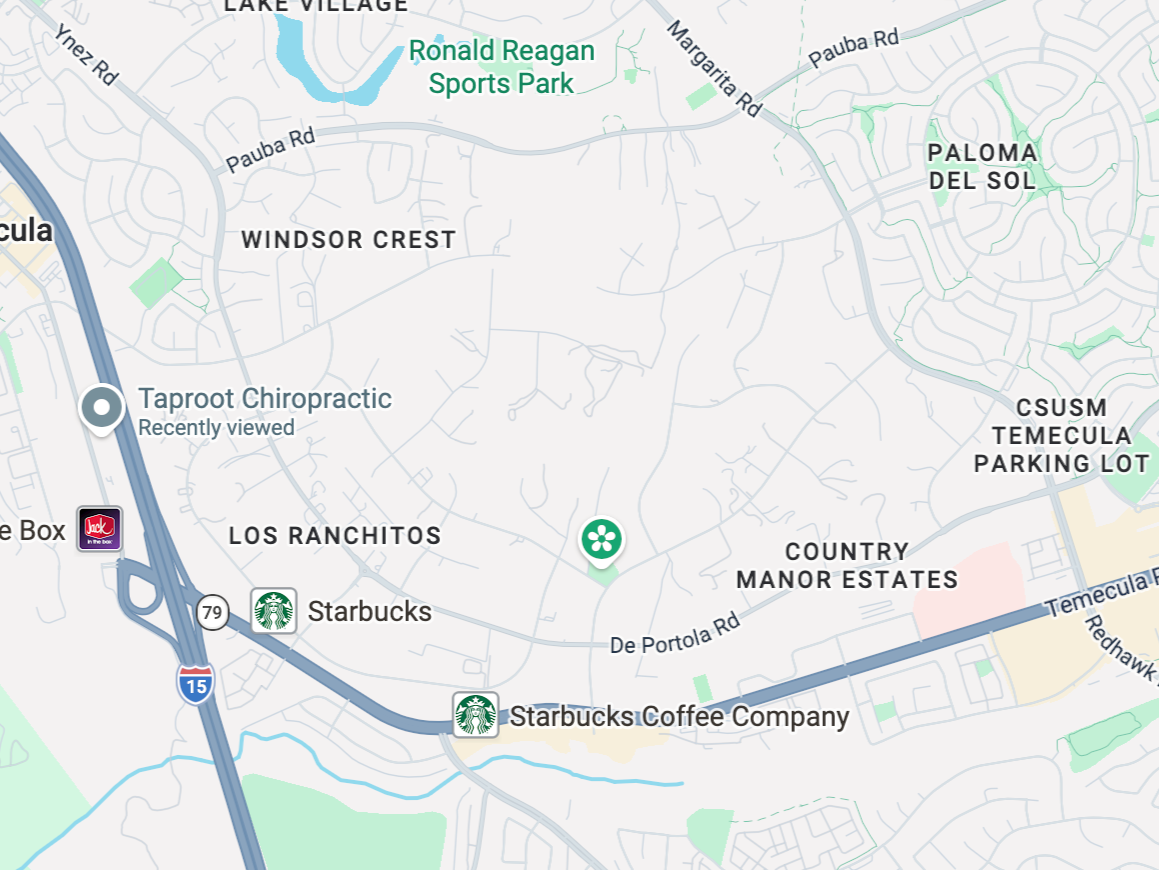 Taproot Chiropractic is located at 28936 Old Town Front St., Suite 106 — right in Old Town Temecula, a short drive from the Wine Country area. Whether you're coming from Rancho California Road, Butterfield Stage, or the De Portola corridor, our office is easy to reach — typically 8–12 minutes.